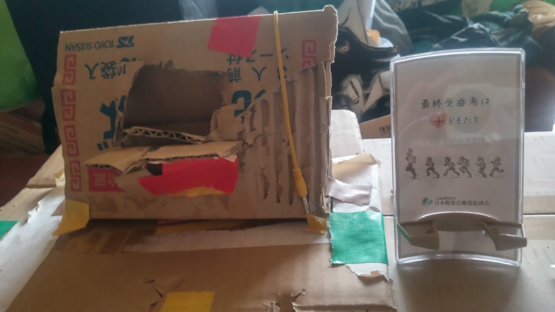 携帯電話を支えていた 段ボールの 真ん中のとこに穴を開けて