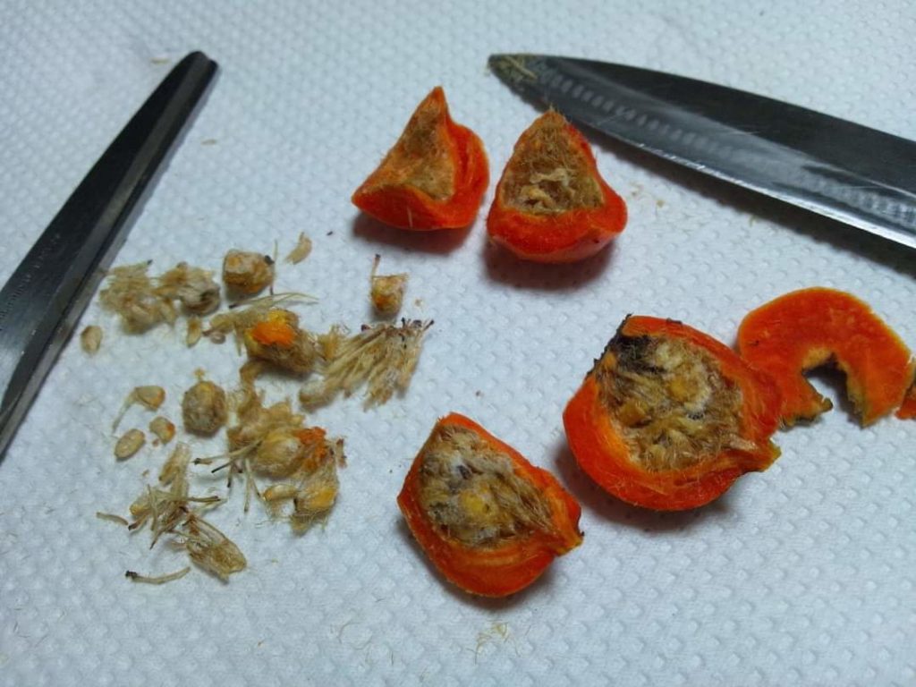 薔薇の実お茶(ローズヒップ)になるらしい てんで切ってみた中の種蒔いたら 芽が出るといいなぁ