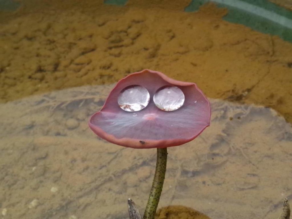 今朝 蓮の 水盤よこに