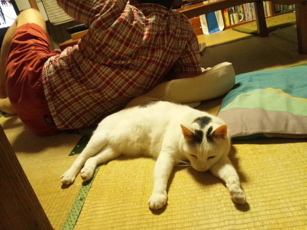 雷 苦手うっし~さっきまだ びくついていたものの茶の間にてあんちやに 寄り添い寛いでおる