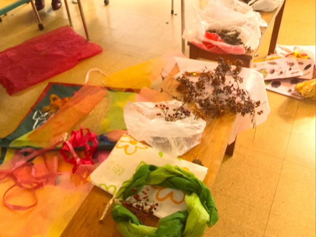 紙皿や ツリーがたの色画用紙 シール リボン カラーモールなど準備してきてくださり