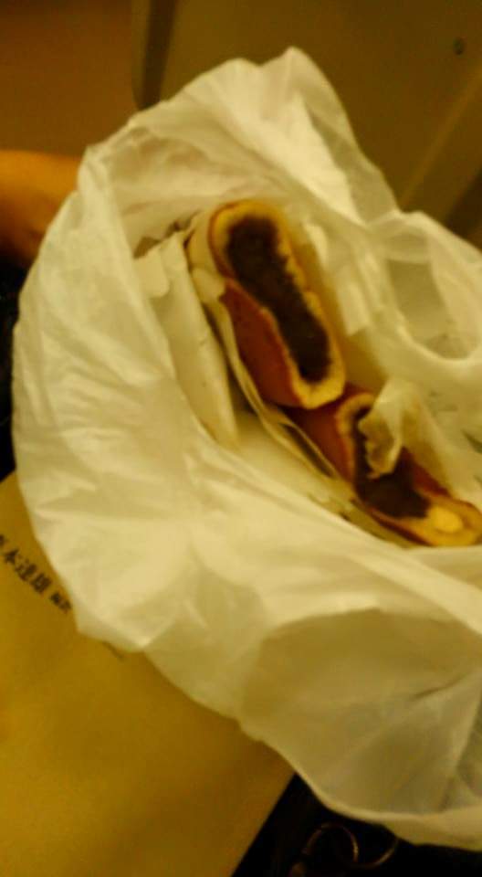 はじっこの 包み紙のとこに あんの水分染みだして