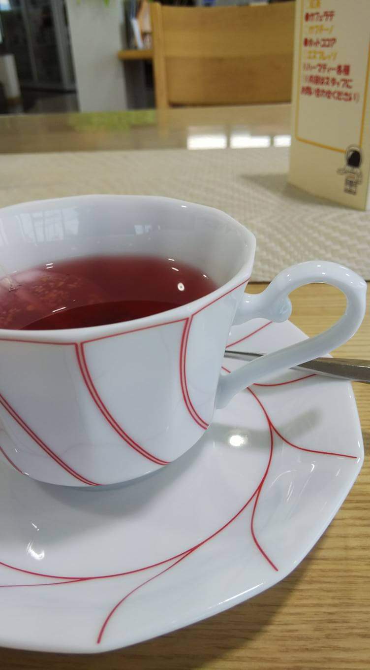 待つ間にいただいた ローズヒップとかハイビスカス辺りのハーブティで