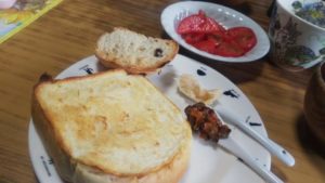 シンプルに パン(バーニャのパン♪)に 「虎バター」ぎーを 塗って そこに ぼっくりジャムを 乗っけてみる