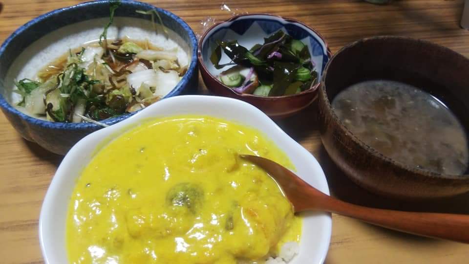 ばんげのおかずを 前日シチューのリメイクで カレーっぽいものにして