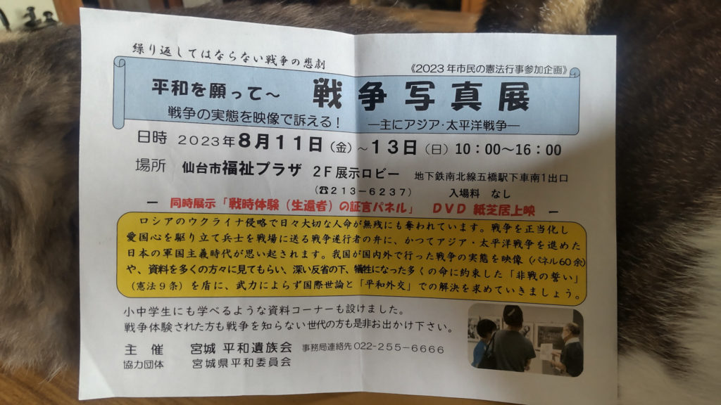 それは「繰り返してはならない戦争の悲劇 平和を願って〜戦争写真展 戦争の実態を映像で訴える!ー主にアジア・太平洋戦争ー」宮城平和遺族会のチラシ