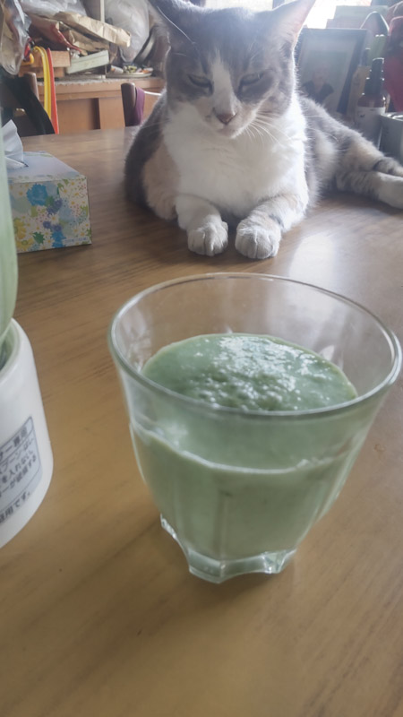 ゴーヤーと バナナと 牛乳で 緑のなめらかさんなぞ こさえて
