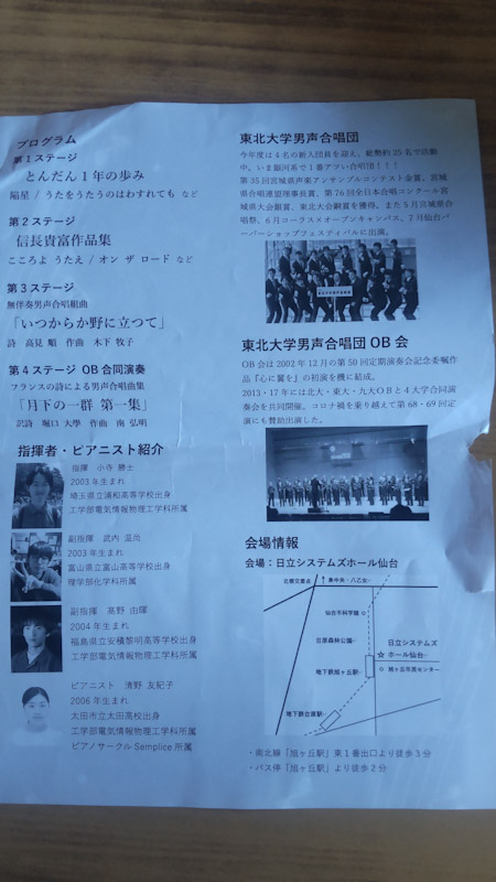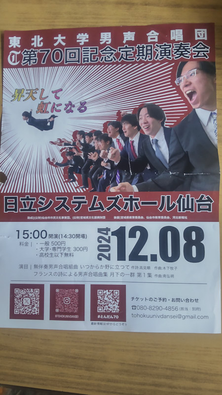 東北大学男声合唱団の 第70回定期演奏会に 男声OB会が 出演するために あちこちから 来仙するのをきっかけに