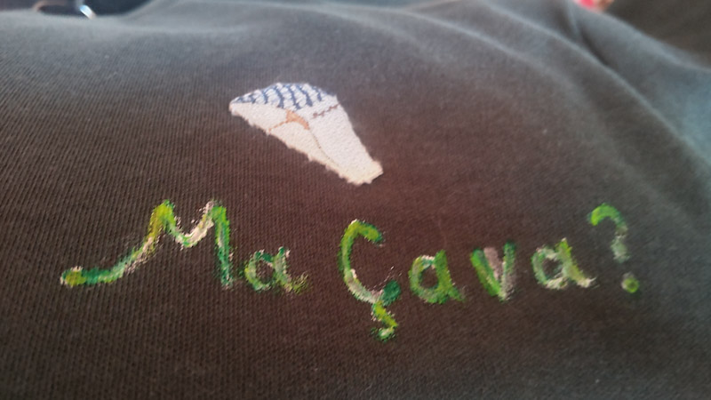 刺繍ワッペン縫い付けて 文字など 書いてみる(途中 にゃんこらに踏まれて ぶれぶれ…)