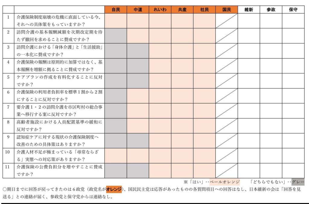 2月8日の衆院選を前に、「ケア社会をつくる会」(代表:上野千鶴子)が主要政党に対し、介護保険制度に関する緊急アンケートを実施した。回答期日までに応じたのは6政党。国民民主党は回答フォームを受け取ったものの、設問への回答はなし。日本維新の会は「回答を見送る」と連絡。参政党と保守党は連絡すらなかった。