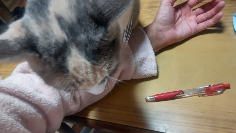 飯台にて だーちゃん(避妊済 6歳)の 腕枕お役目 仰せつかってしまった