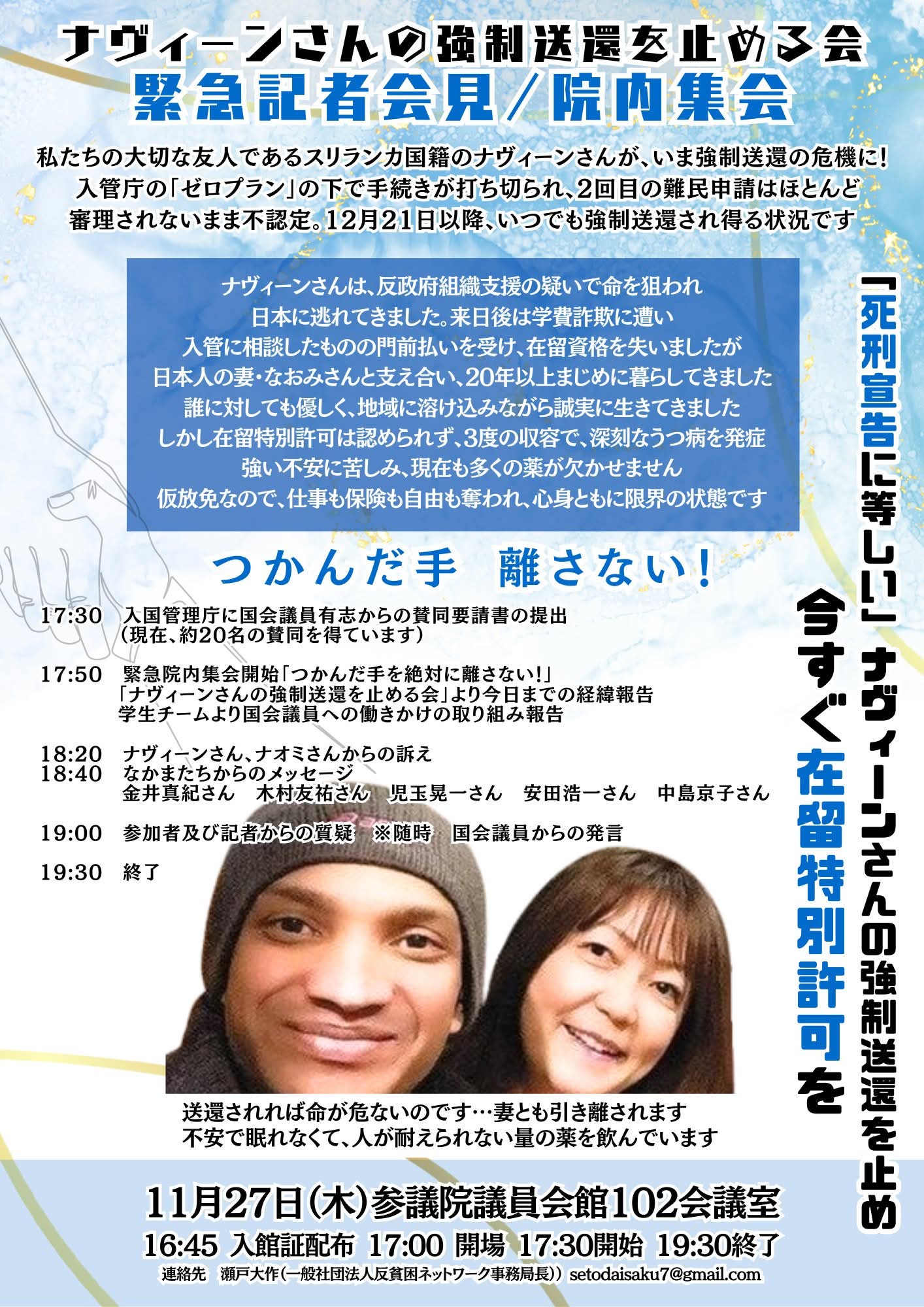 ナヴィーンさんは20年前、スリランカで反政府組織の支援に関わったことから命を狙われ、日本に逃れてきました。、留学生として来日しましたが、入学後間もなくして学費を仲介業者に着服されたことがわかり入管に相談したものの門前払いを受け、不信と孤立の中で在留資格を失いました。その後、日本で出会った妻のなおみさん(日本人)と支え合いながら、21年間この国で暮らしてきました。誰に対しても優しく、地域に溶け込みながら誠実に生きてきました。しかし、在留特別許可は認められず、3度の収容を経験。過酷な環境の中で深刻なうつ病を発症し、現在も多くの薬に頼って生活しています。