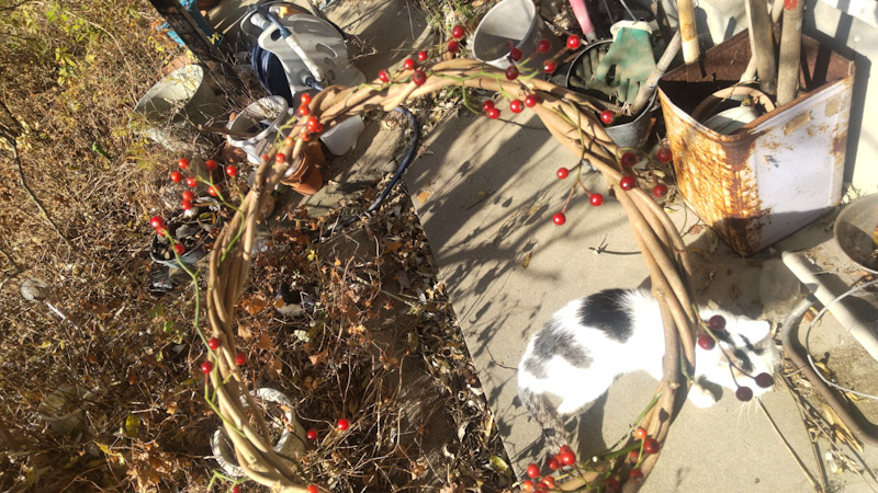 本日は ゆるりのろりと 藪庭の 藤蔓と 野薔薇の実で