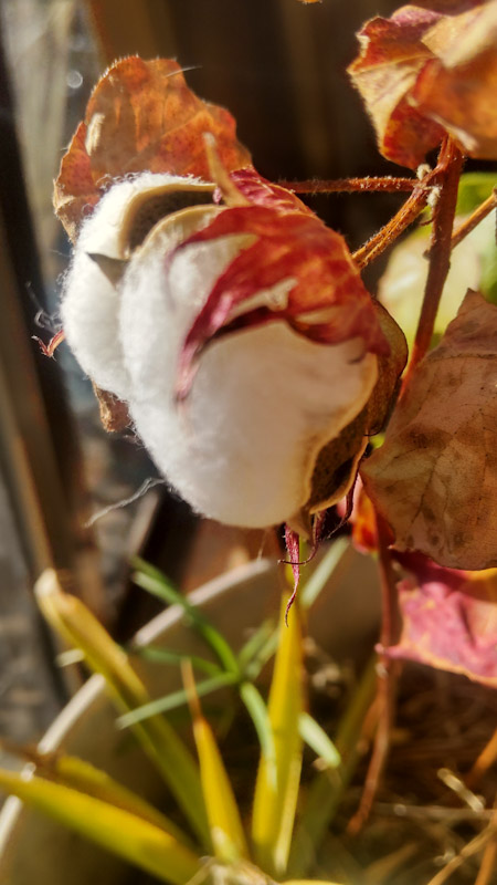 植木鉢の 綿の実が 弾けてきてる