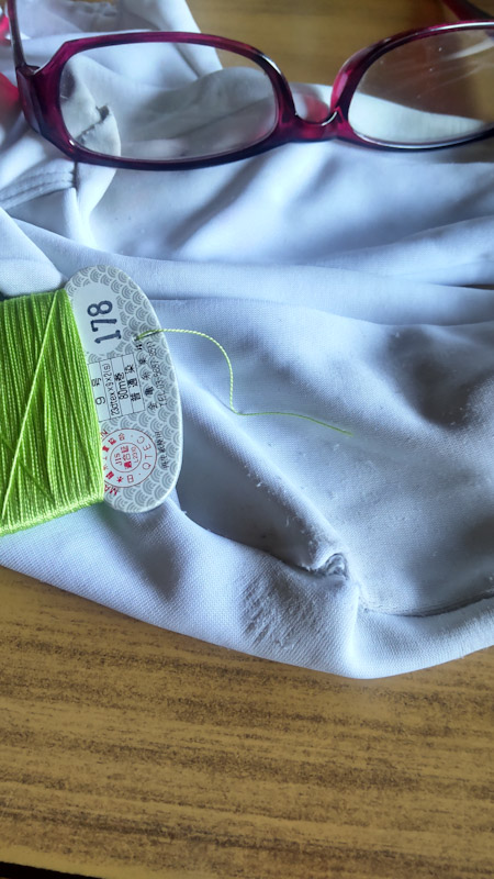 これを繕って 履こうか…しかし 繕いの 白糸が どこかに紛れてしまって(そんなんばっかり!)見当たらず