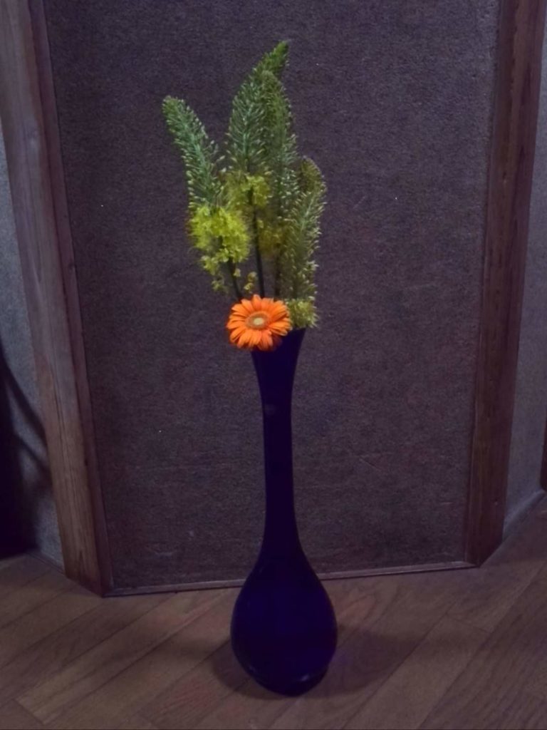 再構成 なんつうとその道のひとみたいだが昨日いただいた ど~ん!と お花たちお花についての 芸も技もないので同じ種類とか似た色て 分けてのち面倒になり ざかざかと 活けてしまいました丈の高い ひょんひょんした花と ガーベラをひょろり青硝子の容れ物に…なんか かっちょいい♪