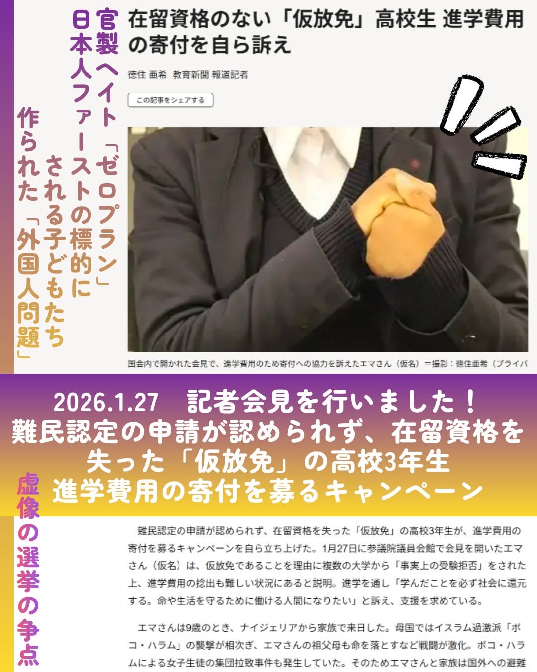 公示日1月27日、大義なき解散総選挙の中で、つくられた「#外国人問題」として常に槍玉に挙げられる「#非正規滞在(#不法滞在)」状態の子どもが、自ら記者会見をしました。私も「仮放免高校生奨学金プロジェクト」で伴走支援に関わってきたエマさんです。