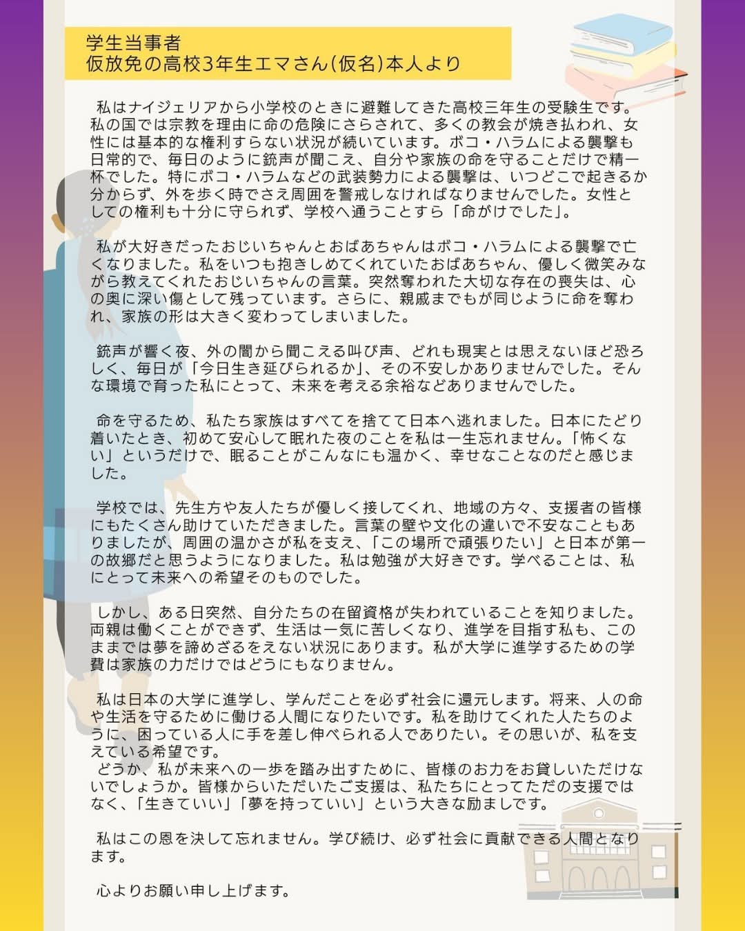 エマさんのように、非正規滞在状態の友だちが、いまも大学に進学するために頑張っています。